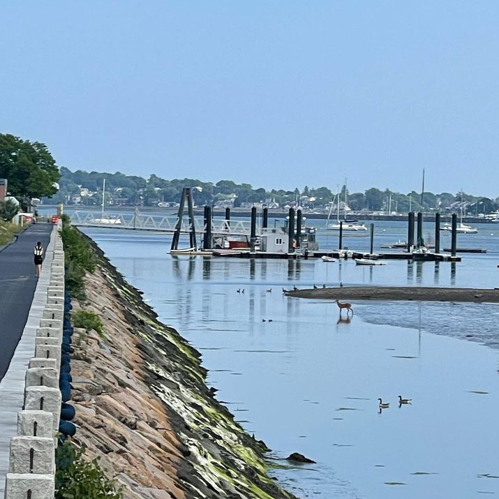 A fawn (looks like a fawn, right?) was spotted in Dorchester on Friday off of the UMass campus along the water’s edge.